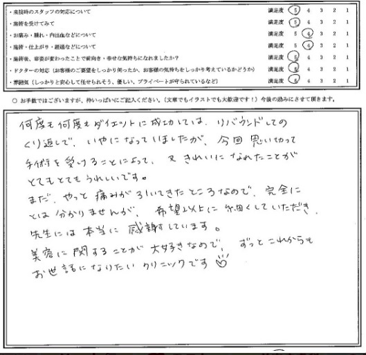 何度も何度もダイエットに成功しては、リバウンドしてのくり返しで、嫌になっていましたが、今回思い切って、手術を受けることによって、又きれいになれたことがとてもとてもうれしいです。