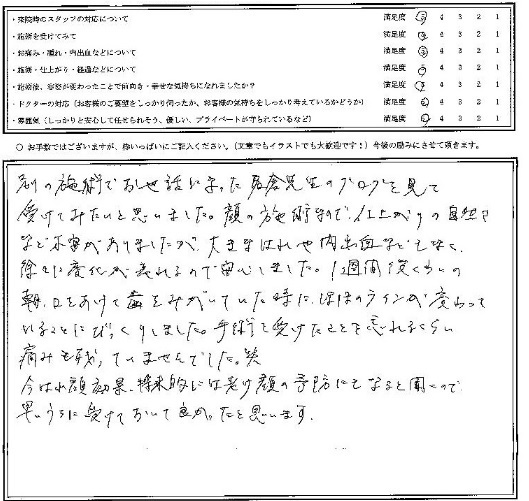 顔の施術なので仕上がりの自然さなど不安がありましたが、大きな腫れや内出血なども無く、徐々に変化が現れるので安心しました。