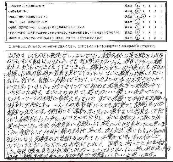 カウンセリングで初めて名倉先生に相談させていただいた時も、すごくさわやかで、感じのいい優しい先生でした。とっても一つ一つの手術に自信をもっていて、すごく信頼して手術をお願いする事が出来ました。