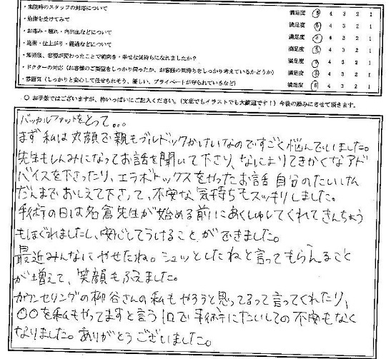 手術の日は名倉先生が始める前にあくしゅしてくれて緊張もほぐれましたし、安心してうけることができました。