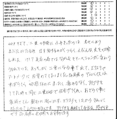 Dr名倉のアドバイスは素晴らしく、切開なのにまったく痛みも無く、アイプチをしてた時と同じ二重幅で仕上げてくれ、驚くことに家族でさえ整形に気づかず、エクステをしたからきれいになったの?レベルなんです。アイプチを普段してる方は怖がらずぜひDr名倉の全切開をオススメします。