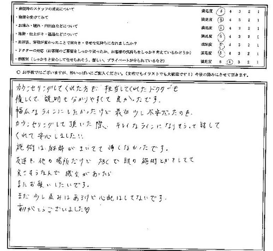 カウンセリングしてくれた方も、担当してくれたドクターも、優しくて、説明も分かりやすくて良かったです。