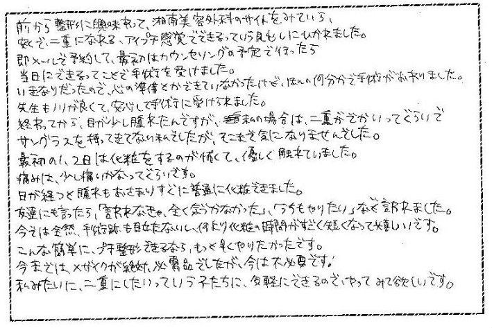 前から整形に興味があって、湘南美容外科のサイトを見ていたら、安くて二重になれる、アイプチ感覚で出来るっていう見出しに惹かれました。
