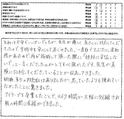 当初は不安でいっぱいでしたが、名倉先生が優しく、気さくに対応して下さったので、手術中も安心して過ごせました。一度目でまぶたに違和感があったので、再び施術して頂いた際に「絶対に妥協しないで」と一言くださったのがとても心強かったです。名倉先生が真剣に向き合って下さっていることが伝わってきました。
