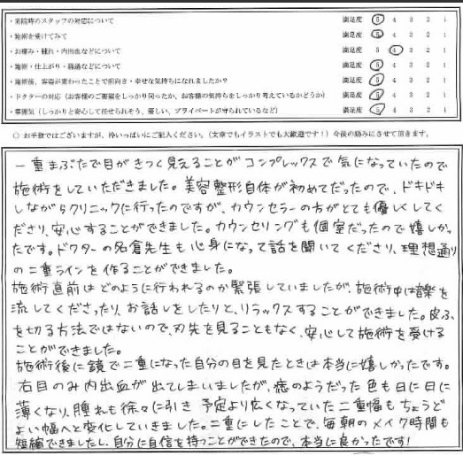 ドクターの名倉先生も心身になって話を聞いてくださり、理想通りの二重ラインを作ることができました。