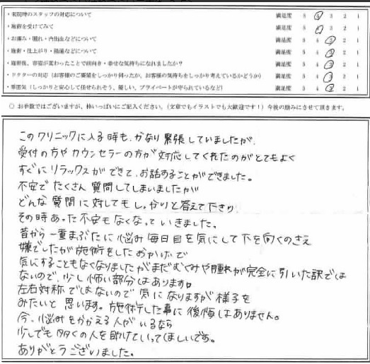 昔から一重まぶたに悩み、毎日目を気にして下を向くのさえ嫌でしたが、施術したおかげで気にすることもなくなりましたが、まだむくみや腫れが完全に引いた訳ではないので、少し怖い部分はあります。