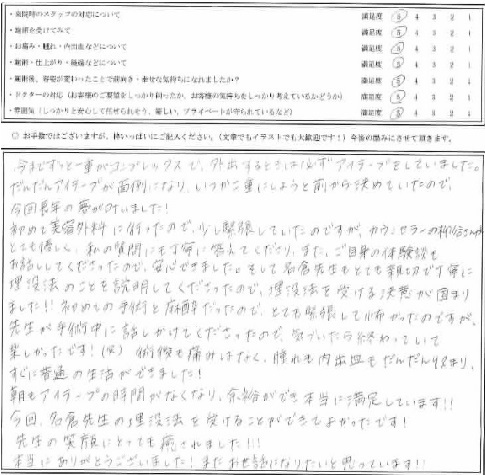 初めて美容外科に行ったので、少し緊張していたのですが、カウンセラーの柳谷さんがとても優しく、私の質問にも丁寧に答えてくださり、また、ご自身の体験談もお話してくださったので、安心できました。そして、名倉先生もとても親切で、丁寧に埋没法のことを説明してくださったので、埋没法を受ける決意が固まりました!!