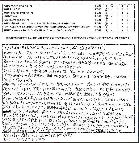 今回クリニックのホームページでモニター募集の事を知って、思い切って予約、カウンセリングを受けたところ、様々な質問に細かく答えていただき、施術の内容についても非常に分かりやすく説明して下さいました。また、費用についても他院で見た金額より大変手頃で、その日のうちに施術を受けることを決意しました。