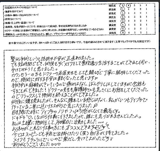 でも短時間ででき、術後もすぐメイクをして普段通り生活することが出来ると伺い、受けてみよう!と思いました。