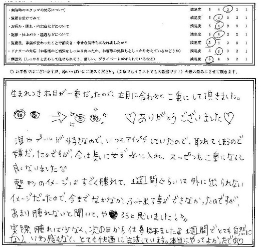 生まれつき右目が一重だったので、左目に合わせて二重にして頂きました。ありがとうございました?