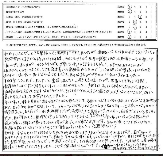手術室に入ったら、またすごい緊張しましたし怖さもありましたが、準備して待っている間、看護師さんがずっと話をしてくれていて助かりました。手術はあっという間だった気がしますが、麻酔の効き具合は大丈夫なのかなとか、目に何か当たっているこの痛さは大丈夫かなとか、何か色々と考えてしまって不安になっていました。