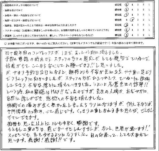 が、やはり予約日当日になると、期待よりも不安が先に立ち、やや重い足どりでクリニックに向かいましたが、スタッフの方がひとつひとつ、丁寧に説明して下さり、不安は徐々に消えていきました。いよいよ名倉先生の診察!!という時、私の緊張はMAX!!だったのですが、先生の人柄か、おだやかに、自然に話しができ、施術への不安も消えました。