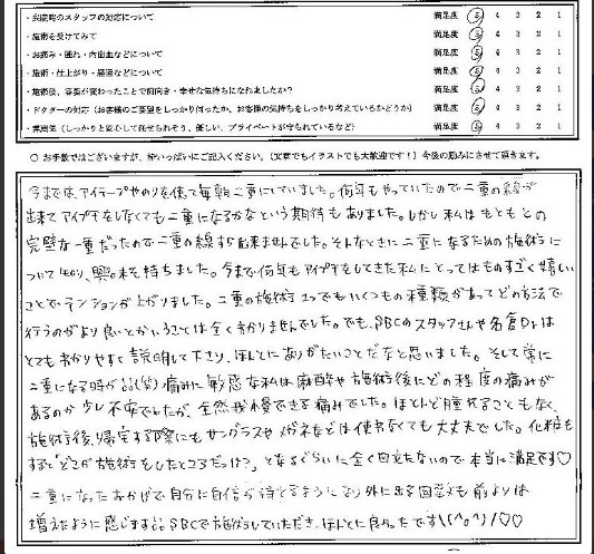 二重になったおかげで自分に自信を持てるようになり、外に出る回数も前よりは増えたように感じます!!SBCで施術していただき、ほんとに良かったです!!