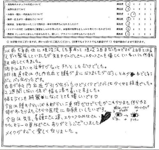 以前5年前位に埋没法した事あって埋没2回目だったのですが、2回目とは言えずっと緊張していましたが、名倉先生や看護師さん、スタッフさんも優しく丁寧に何度も説明してくれました。