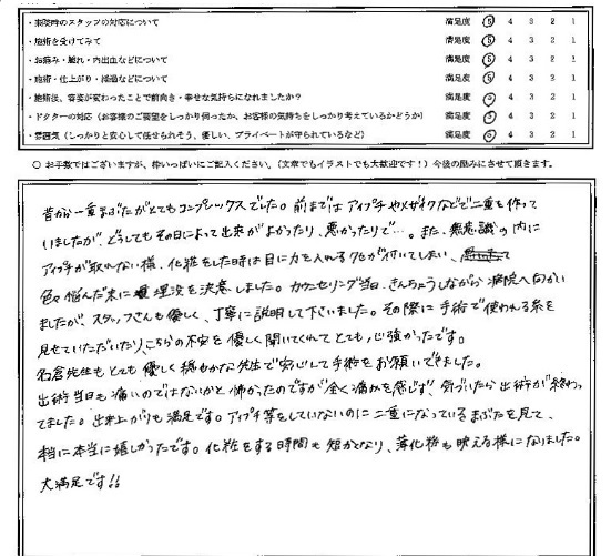 アイプチ等をしていないのに二重になっているまぶたを見て、本当に本当に嬉しかったです。化粧をする時間も短かくなり、薄化粧も映える様になりました。