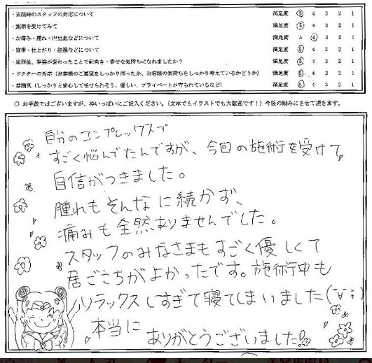 自分のコンプレックスで、すごく悩んでたんですが、今回の施術を受けて、自信がつきました。