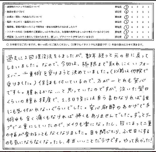 なので今回は、極限まで取れにくいフォーエバー二重術を受けようと決めていました。(以前は他院で受けました。)