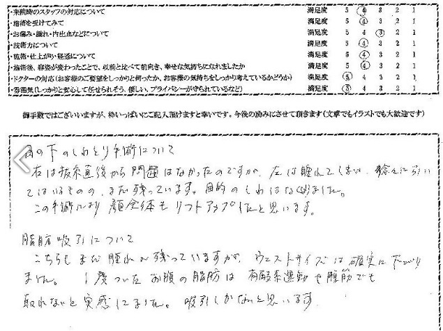 こちらもまだ腫れが残っていますが、ウエストサイズは確実に下がりました。一度ついたお腹の脂肪は、有酸素運動や腹筋でも取れないと実感してました。吸引しかないと思います。
