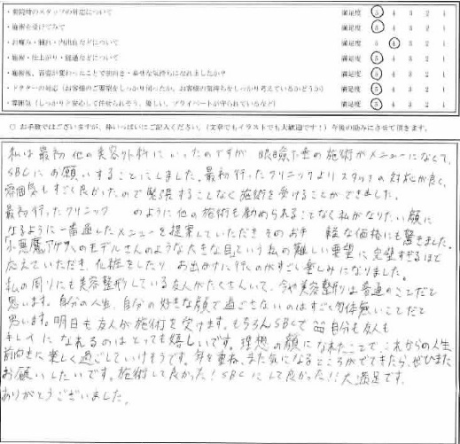 私は最初、他の美容外科にいったのですが、眼瞼下垂の施術がメニューになくて、SBCにお願いすることにしました。最初行ったクリニックよりスタッフの対応が良く、雰囲気もすごく良かったので、緊張することなく施術を受けることができました。最初行ったクリニックのように、他の施術も勧められることなく、私がなりたい顔になるように一番適したメニューを提案していただき、そのお手軽な価格にも驚きました。「小悪魔アゲハのモデルさんのような大きな目」という私の難しい要望に、完璧すぎるほど応えていただき、化粧をしたり、お出かけに行くのがすごく楽しみになりました。