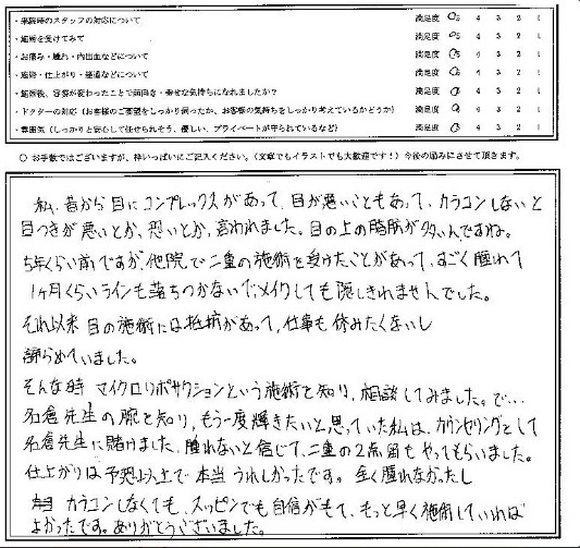 仕上がりは予想以上で、本当嬉しかったです。全く腫れなかったし、カラコンしなくてもスッピンでも自信が持て、もっと早く施術していれば良かったです。ありがとうございました。