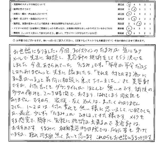 お世話になりました。今回、フェイスラインのたるみが気になり、メールで先生に相談し、美容針の施術をしてもらう決心をしました。