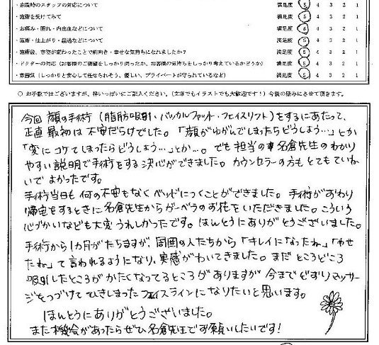 手術から1カ月がたちますが、周囲の人たちから「キレイになったね」「やせたね」と言われるようになり、実感がわいてきました。まだところどころ吸引したところがかたくなってるところがありますが、今までどおりマッサージを続けて引き締まったフェイスラインになりたいと思います。