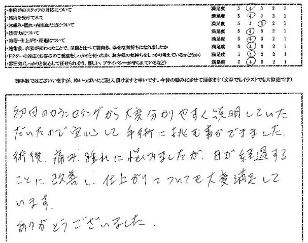 初回のカウンセリングから大変分かりやすく説明して頂いたので、安心して手術に挑むことが出来ました。