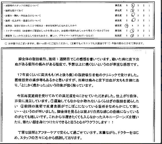 ?前回の施術で皮膚表面が凸凹になっている箇所を滑らかにしてほしい…というのが叶いました。脚全体を見ると以前より自然な感じの曲線になっているのがとても嬉しいです。