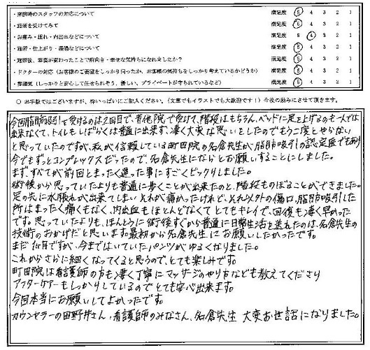 今回脂肪吸引を受けるのは2回目で、昔他院で受けて、階段はもちろん、ベッドに足を上げるのも一人では出来なくて、トイレもしばらくは普通に出来ず、凄く大変な思いをしたのでもう二度とやらないと思っていたのですが、私が信頼している町田院の名倉先生が脂肪吸引の認定医でもあり、今でもずっとコンプレックスだったので、名倉先生にならとお願いすることにしました。