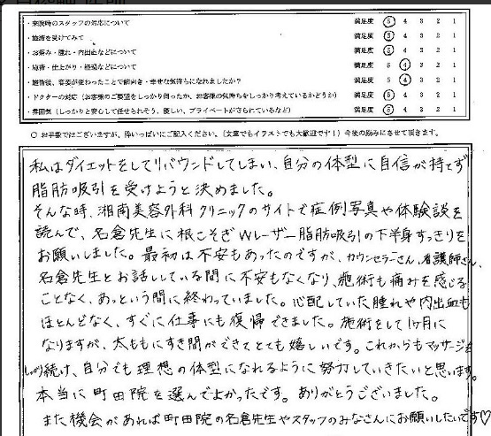 そんな時、湘南美容外科クリニックのサイトで症例写真や体験談を読んで、名倉先生に根こそぎWレーザー脂肪吸引の下半身すっきりをお願いしました。