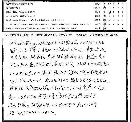 SBCさんは受付からカウンセリングそして施術まで、どのスタッフの方も皆様大変丁寧で親切な対応を取って下さり、感動しました。