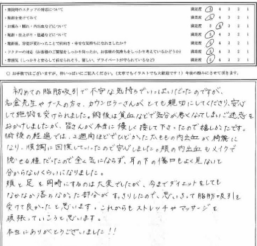 初めての脂肪吸引で不安な気持ちでいっぱいだったのですが、名倉先生やナースの方々、カウンセラーさんがとても親切にしてくださり、安心して施術を受けられました。