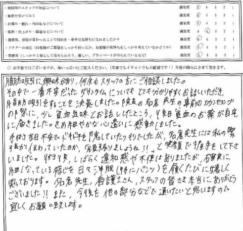 脂肪吸引に興味があり、何度もスタッフの方にご相談しました。