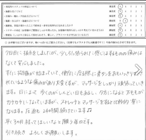 7日目に抜糸をしましたが、少し引っ張られた感じはするものの痛みはなくて安心しました。