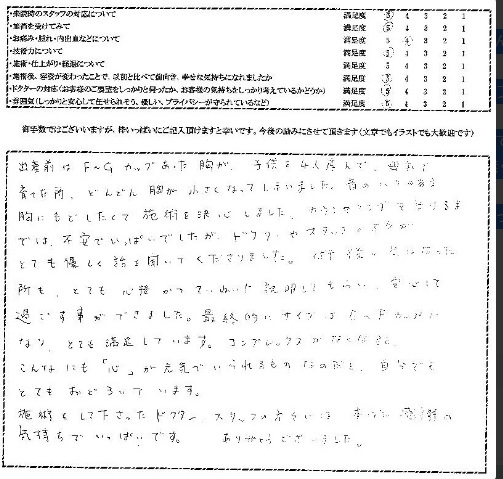 術後の気になったところも、とても親切かつ丁寧に説明してもらい、安心して過ごすことが出来ました。最終的にサイズはE~Fカップになり、とても満足しています。コンプレックスが無くなるとこんなにも「心」が元気でいられるものなのだと、自分でもとても驚いています。