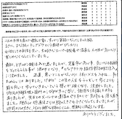 術後の脂肪吸引箇所のしびれがきつく感じ、施術を後悔した時もありましたが、先生とのメールでの直接のやり取りで気持ちも落ち着きました。現在は術直後よりは胸の大きさも小さくなってしまいましたが、術前よりは大きく、何より自然な胸のふくらみ、感触に満足しています。