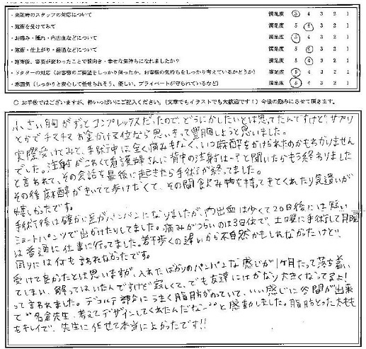 受けて良かったとは思いますが、入れたばかりのパンパンな感じが1ヶ月たって落ち着いてしまい、解ってはいたんですけど寂しくて、でも友達にはかなり大きくなってるよ!って言われました。デコルテ部分にうまく脂肪がのっていて、いい感じに谷間が出来て、“名倉先生、考えてデザインしてくれたんだなー”と感動しました。脂肪とった太もももキレイで、名倉先生に任せて本当によかったです!!