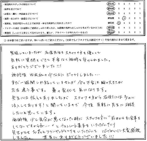 緊張していましたが、名倉先生もスタッフの方も優しくて、気軽に質問もできて、不安なく施術を受けられました。