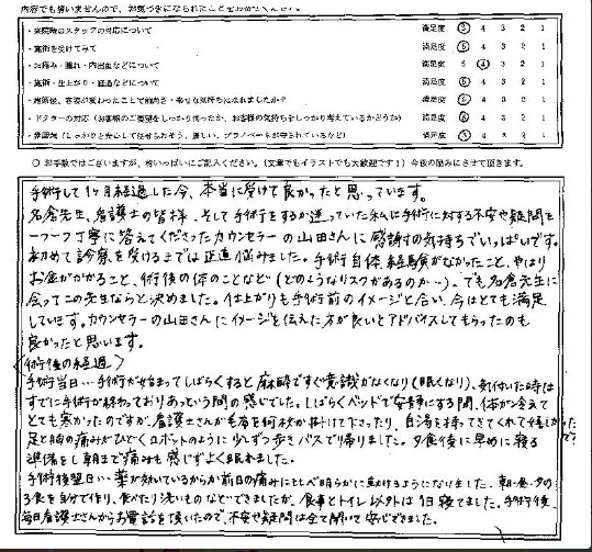 名倉先生、看護師の皆さま、そして手術をするか迷っていた私に、手術に対する不安や疑問を一つ一つ丁寧に答えてくださったカウンセラーの山田さんに、感謝の気持ちでいっぱいです。