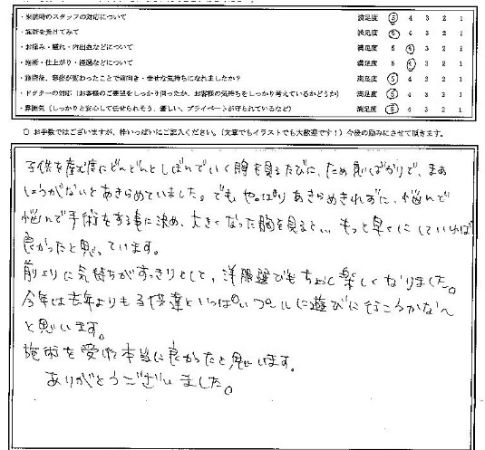 子供を産む度にどんどんとしぼんでいく胸を見るたびに、ため息ばかりで、まぁ、しょうがないとあきらめていました。でも、やっぱりあきらめきれずに、悩んで悩んで手術をする事に決め、大きくなった胸を見ると…もっと早くにしていれば良かったと思っています。