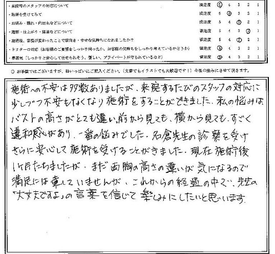 現在施術後1ヶ月経ちましたが、まだ両胸の高さの違いが気になるので満足には達していませんが、これからの経過の中で、名倉先生の「大丈夫ですよ」の言葉を信じて楽しみにしたいと思います。