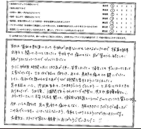 足や胸のハレ、内出血跡も、このままだったらどうしよう…と不安になるときもありましたが、3日後、1週間後のカウンセリングの際に、先生や看護婦さん、カウンセラーさんに不安な点を聞いて、順調な経過と言うことでホッとしたことを覚えています。