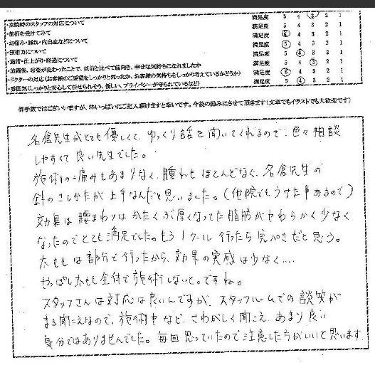 施術の痛みもあまりなく、腫れもほとんどなく、名倉先生の針のさしかたが上手なんだと思いました。(他院でも受けた事あるので)