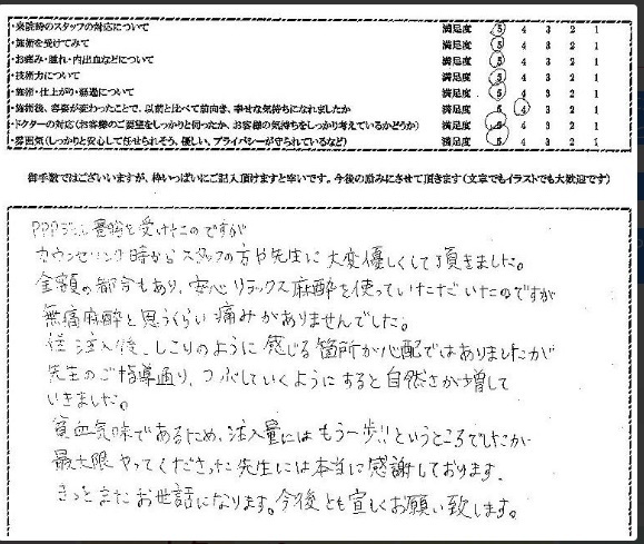 貧血気味であるため、注入量にはもう一歩!!というところでしたが、最大限やってくださった名倉先生には本当に感謝しております。きっとまたお世話になります。今後とも宜しくお願いします。