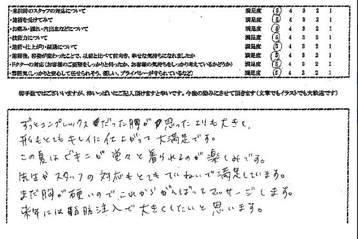 ずっとコンプレックスだった胸が思ったよりも大きく、形もとてもキレイに仕上がって大満足です。