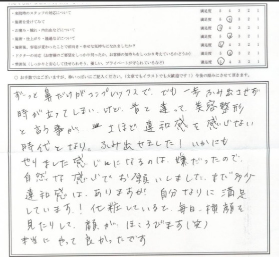 ずっと鼻だけがコンプレックスで、でも一歩ふみ出させず時が立ってしまい、けど、昔と違って、美容整形と言う事がさほど違和感を感じない時代となり、ふみ出せました!